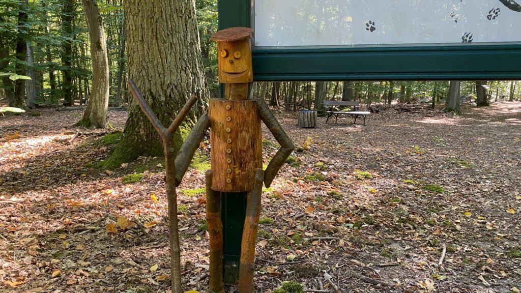 Das passende Holzmännchen dazu findest du am Denkmalstein. Für die Übung kannst du dich auch auf die Holzbank setzen, die dort in der Nähe steht.